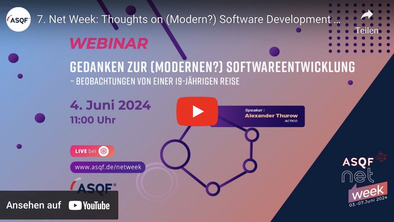 Again, I continued to refine the talk over the next years. In 2024 I decided to finally present it at the “ASQF Net Week” conference. On this occasion the (german) talk was recorded, and is now available on YouTube: